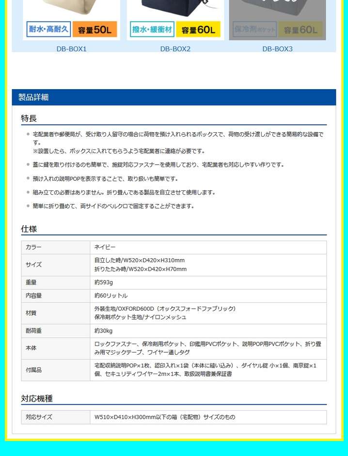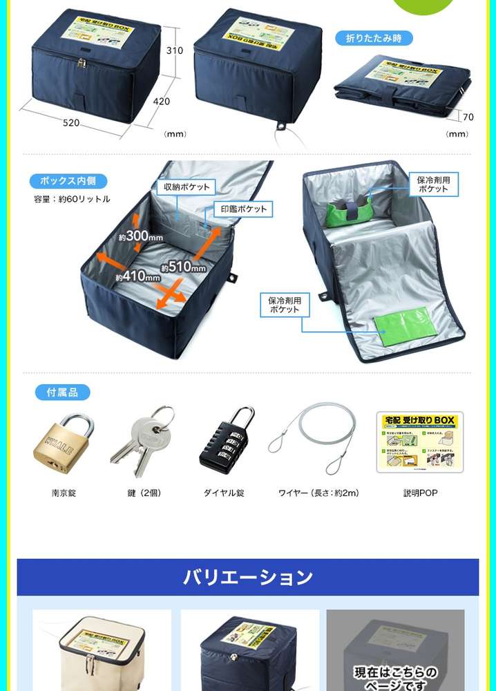 ●付属品:宅配収納説明POP1枚認印入れ1袋(本体に縫い込み)取り扱い説明書兼保証書ダイヤル錠小(SLE-5L同等品)1個南京錠(SLE-2L-1同等品)1個セキュリティワイヤー(SLE-1W-2同等品)1本ワイヤー2m太さ3.5mm