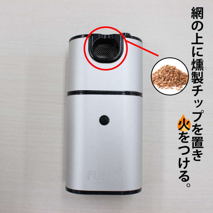 ●1.スモークチップの受け口が天井を向くように本体を置き、スモークチップを受け皿に入れます。スモークチップが受け皿からはみ出す量はいれないでください。