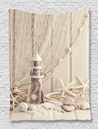 Beach Tapestry Nautical Decor by Ambesonne, Wooden Lighthouse Marine Fishing Net Sea Stars and Shells Picture Print, Bedroom Living Kids Girls Boys Room Dorm Wall Hanging Art, Ecru Ivory Beige