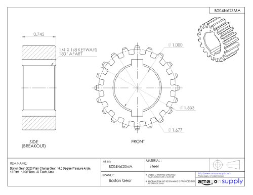 Boston Gear GD20 Plain Change Gear, 14.5 Degree Pressure Angle, 12 Pitch, 1.000" Bore, 20 Teeth, Steel