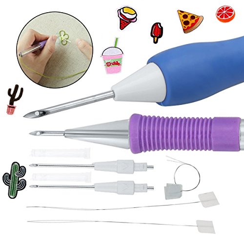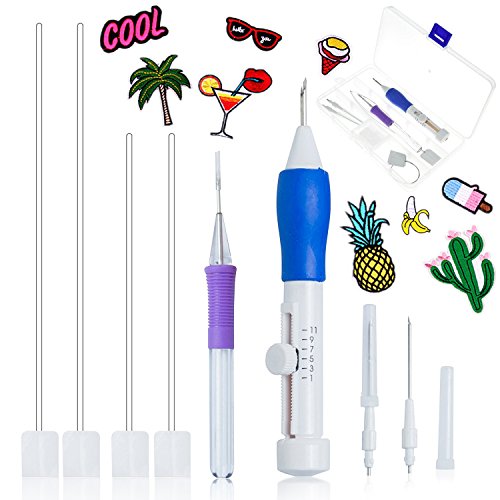 Kabi 7Pcs Embroidery Pen Kit With15Pcs Embroidered Patch Fabric Iron-on, Punch Needle Craft Tool for Embroidery Threaders DIY Sewing