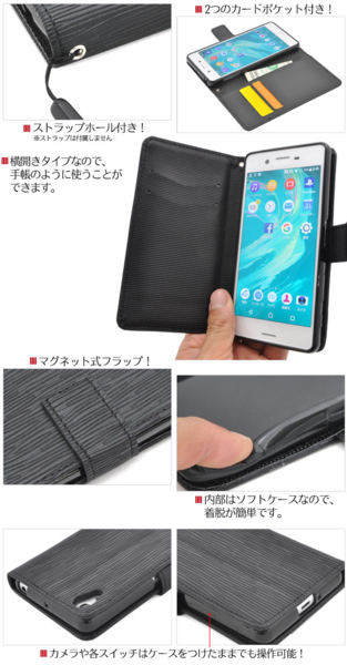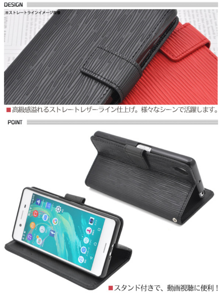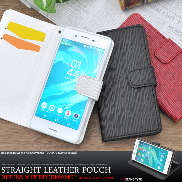 ストレートレザーデザインのXperia X Performance用スタンドケースポーチ。