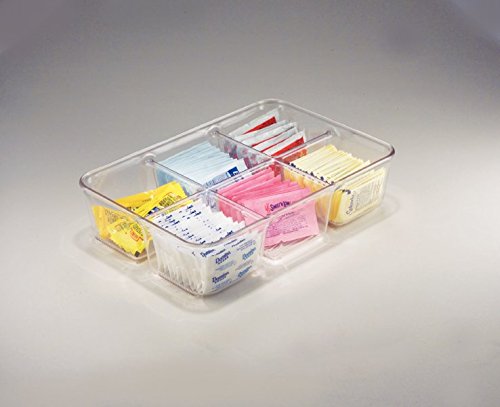 • Organizes sugar or sweetener packets, tea bags, coffee creamer; Also use for ketchup, mustard, soy sauce