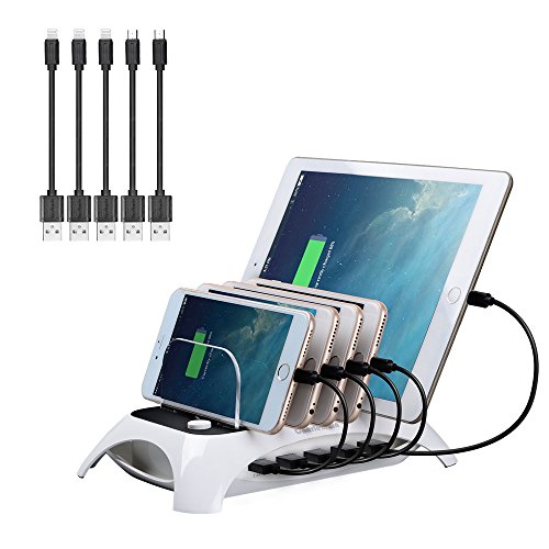 -. Feature : 60W 5-Port Quick Charging Station: Fastest Charging Station (5X2.4A), Charges 5 USB devices simultaneously, each of them would get the max charging speed of 2.4A.Which means you can charge 5 tablets or cellphones at the fastest speed at home or in the office. / Comprehensive compatibility: This multiple usb charger station can work with any usb-charged device: iPhone, iPad, galaxy, kindle, power bank, and other cell phones, tablets. / 5 Short Charging Cables Included: We provide 5 high quality short usb charging cables for you as the picture show (3 iOS & 2 Android).12 Month Worry-free guarantee. / Charging station organizer: The space saving charger stand can steadily hold all your devices in one location, no more messy cords bother you anymore, giving you a tidy, clean desktop, keep everything organized. / Steady and Safety: Built-in surge protection against overcharging, surges and overheating, FCC, CE Certified, ensures steady power output to each device. Even when 5 devices charged simultaneously 24 hours, it's safety.