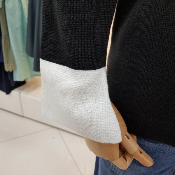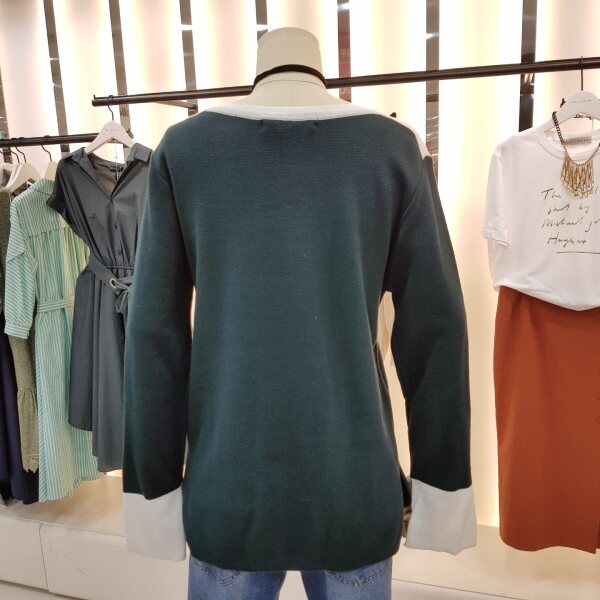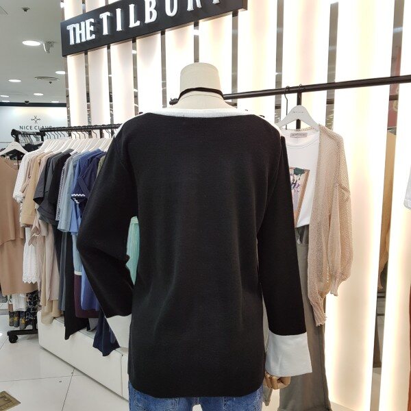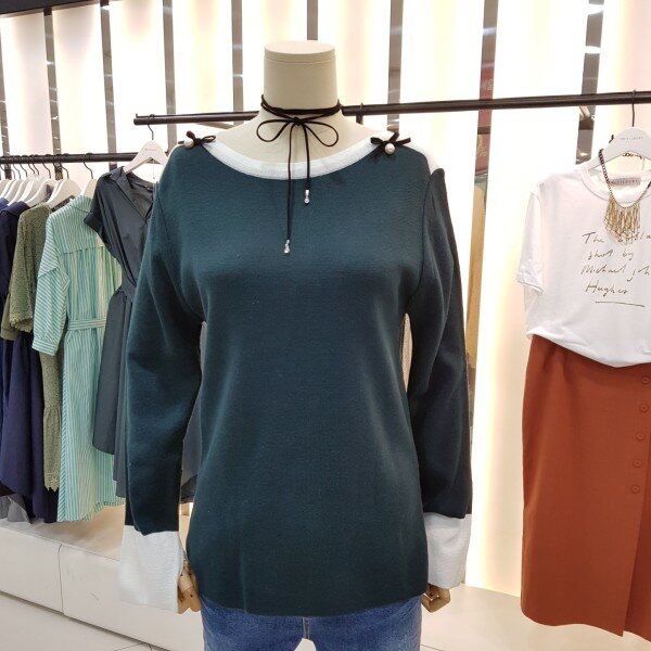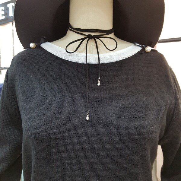 넥라인과 소매의 감각적인 배색 디테일이 포인트가 되는 니트입니다.어깨의 리본 진주장식이 로맨틱한 분위기를 더하며 소프트한 터치감으로 착용감이 좋습니다.