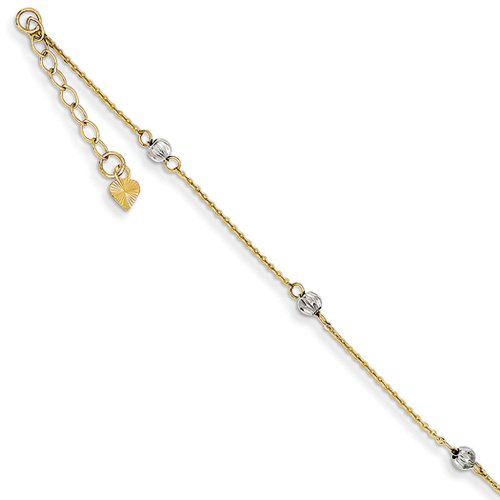 Indulge in a little bling for your leg with a shiny 14k two-tone gold anklet that features 3mm diamond-cut white gold bead stations on delicate cable chain finished with a spring ring clasp and 1-inch chain extender.Feature