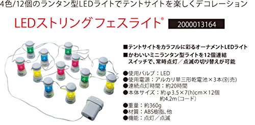 Studio : Coleman (Coleman) Publisher : Coleman (Coleman) Binding : Sports Product Description Size: Light / diameter of about 3.5 ~ 12 pieces height 7cm ~, code length / about 4.2m Weight: about 360g Material: ABS resin, other Power source: AA batteries ~ 3 (not included) Continuous lighting time: about 20 hours The set includes: 12 lantern-type light (Globe color / yellow, pink, green, blue four each) Switch: ON, OFF, flashing Use valve: LED > More 0