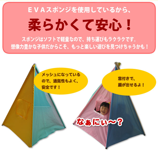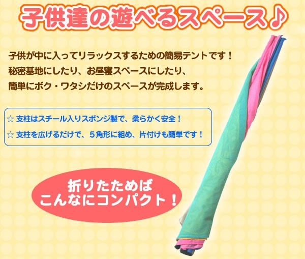 子供が中に入れる簡易テントです!秘密基地やお昼寝スペースにピッタリ!簡単にボク・ワタシだけのスペースが完成します。支柱はスチール入りスポンジ製で、柔らかく安全!