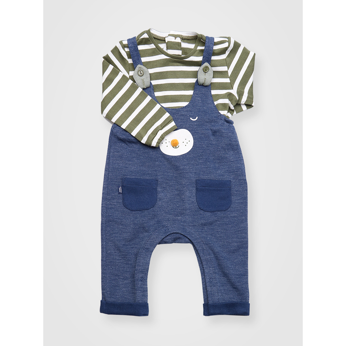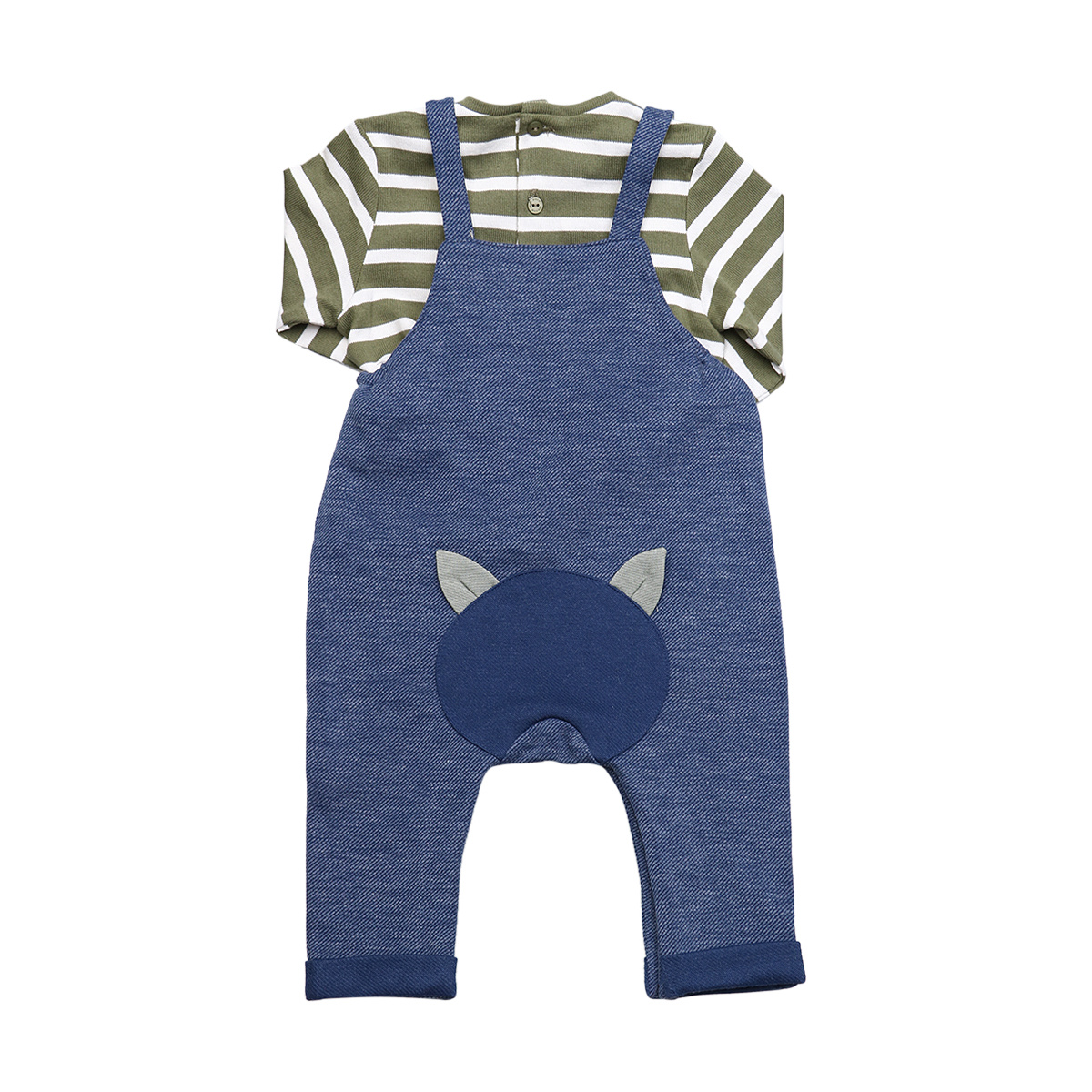 데님 느낌의 멜빵바지와 그린색의 스트라이프가 아주 조화로운 멜빵 상하복 입니다 멜빵바지는 단추로 길이조절이 가능하며 기저귀 갈기에 편한 스냅이 있어 편리한 디자인입니다 티셔츠는 다른 제품과 코디해도좋은 기본적인 스타일 입니다