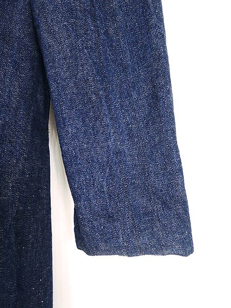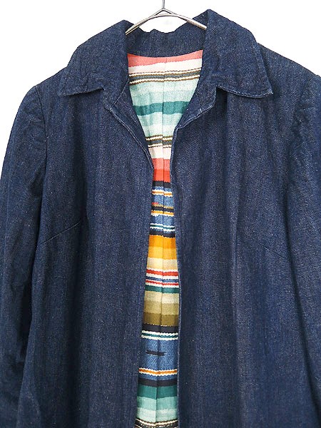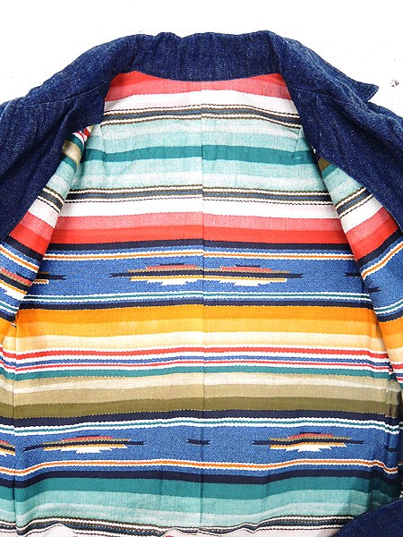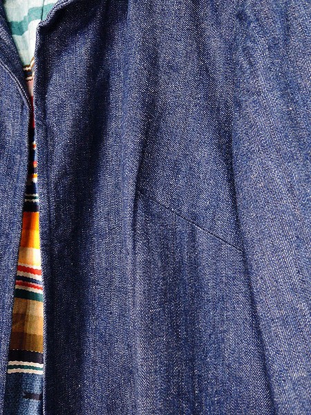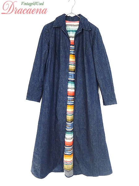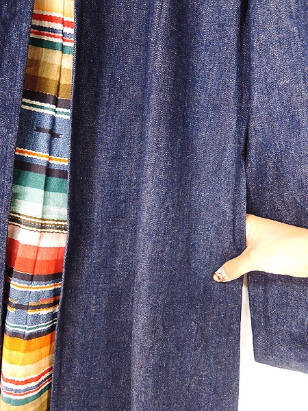 Ladies ブランド- カラー紺 メール便不可 コンディション★★★ 素材デニム 表記サイズ- スタッフコメントタグなし。裏地付き、カラフルなネイティブ柄がデニム地に映えます◎ 実寸サイズ 着丈 123 cm 身幅 49 cm 肩幅 39 cm 袖丈 58 cm ※ウエスト・ヒップ以外は平置き採寸
