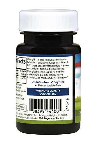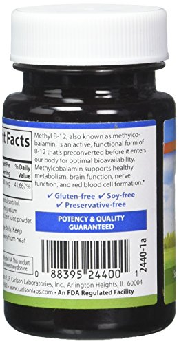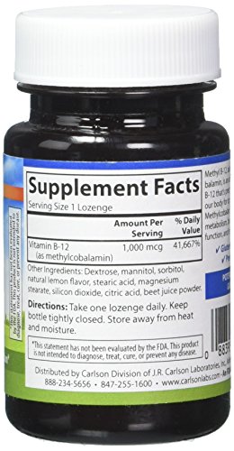 ReleaseDate : 2016-12-27 Studio : Carlson Labs Publisher : Carlson Labs Binding : Health and Beauty Product Description Carlson Labs' Methyl B-12 is a unique and powerful supplement that provides 1,000mcg of vitamin B-12 per lozenge. B-12 promotes healthy energy metabolism, and supports healthy brain and nerve function. It also promotes healthy red blood cell formation, and Carlson's formula is optimal for faster absorption, which means faster effects. 0