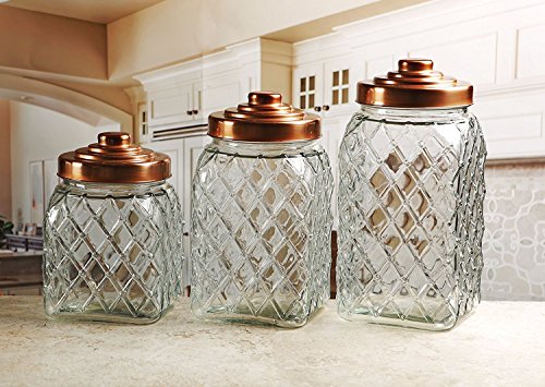 Palais Glassware Preserving Glass Canister Food Jar with Ceramic Lid Handle (Set of 3, Diamond Pattern Glass with Copper Lid)