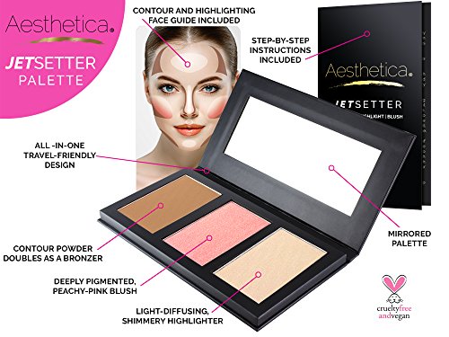 Jetsetter Palette Features: ? A trio of powders all in one: contour bronzer, highlighter, and blush ? Micronized, jet-milled formula ? Packed with light-diffusing particles ? Travel-friendly case ? Ideal for using with other Aesthetica products for a more refined finish ? 100% vegan, cruelty free and gluten free!