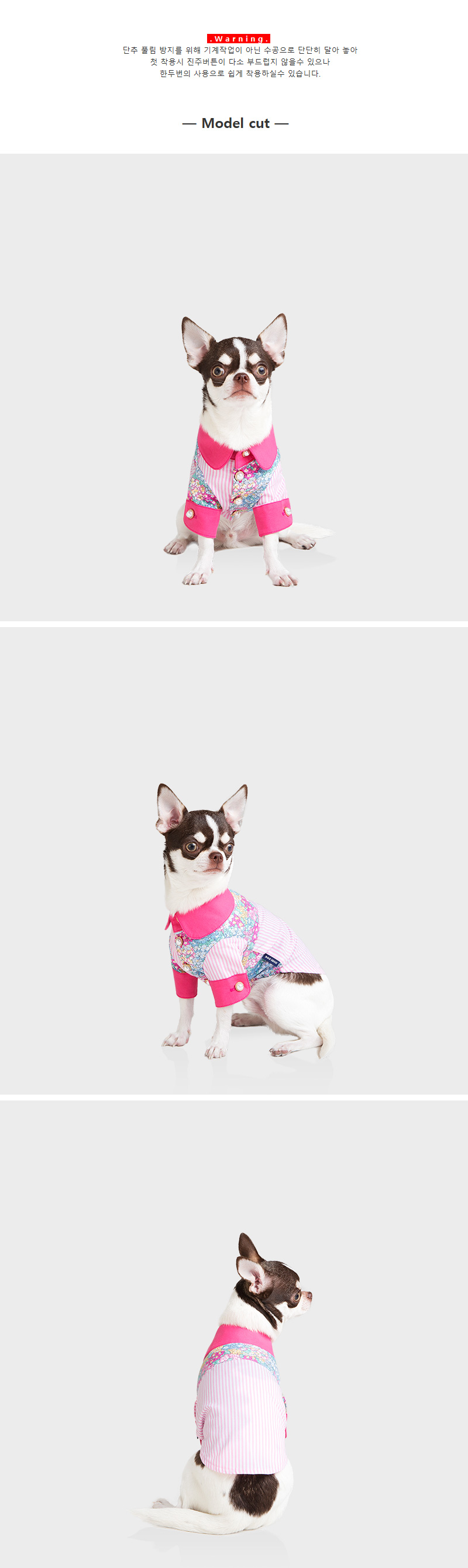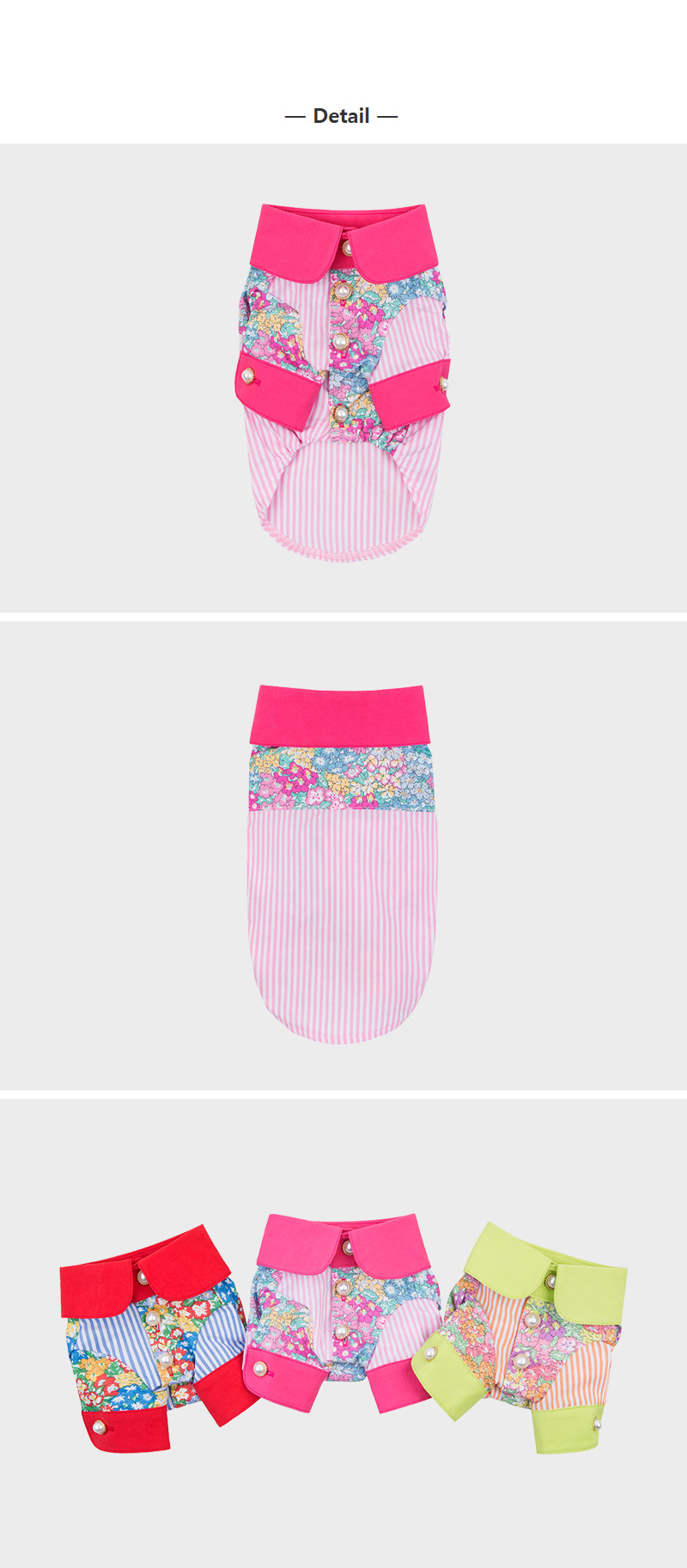 18s/s 두비독만의 감성이 느껴지는 플라워패턴s/t 셔츠 핑크색상을 소개합니다:) 플라워패턴과 스트라이프의 조합으로 시즌무드를 어필하고 시선을 압도하는 세련된 셔츠 입니다. 기존의 셔츠에서는 볼수없던 독특한 디자인과 진주 버튼의 고급스러운 디테일이 볼수록 매력적인 아이템으로 밝고 경쾌한 이미지까지 연출할수있어 이번시즌 소장하시길 추천드려요! 아가보다 더 연약한 댕댕이들의 피부를 고려해 면100% 소재를 사용하고 카라와 소매부분에 사용된 원단 또한 바이오워싱처리되어 먼지가 발생하지 않아 피부가 예민한 아가들에게도 적합합니다. 100%국내생산 두비독만의 입체패턴으로 두비독만의 차별화된 스타일을 즐겨보세요:) |