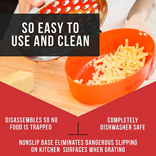 NONSLIP, SAFE DESIGN, EFFICIENT STORAGE & EASY TO CLEAN – Will not slip on kitchen surfaces. Grate at a horizontal angle for comfort, will not cause shredding of knuckles. Multi-grater comes with attachable container base to hold food for mess-free grating, with securely fitting snap on lid. Dishwasher safe, or easily washed with soap and water.