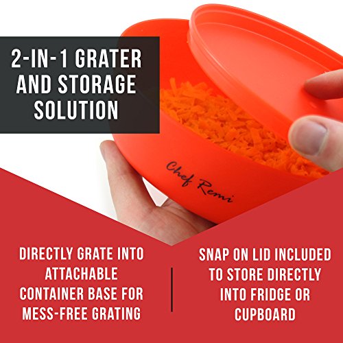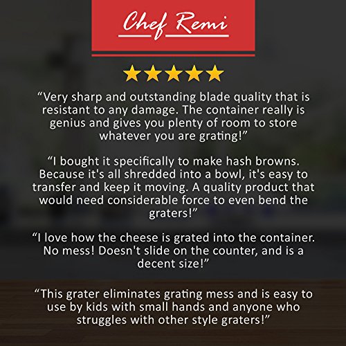 LIFETIME GUARANTEE - The Chef Remi Multifunction Food Grater comes with a 100% Money Back Lifetime Guarantee. You won't get this lifetime guarantee from other big brands. Try It RISK FREE Today!