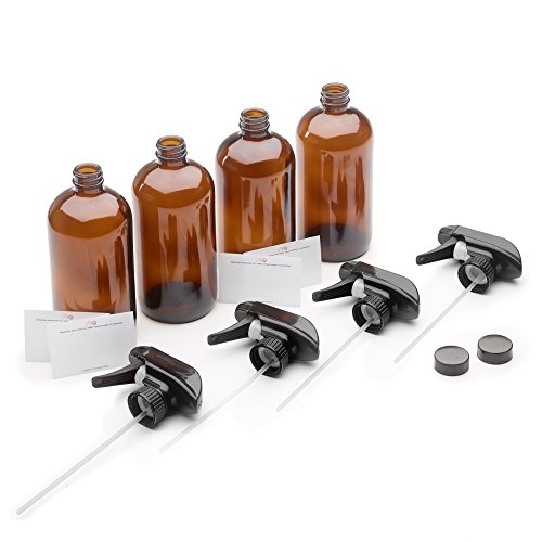 - 4 PACK WITH CAPS AND LABELS INCLUDED - You will receive 4 high quality 16 ounce dark brown amber glass spray bottles, 4 heavy duty spray tops with mist and stream settings, 2 phenolic caps, and 4 labels. The caps are useful so you don't have to worry about storing them with the sprayers attached. This is great because it provides an easy to store, compact solution if you want to create a large batch and store it safely out of the way to use later.