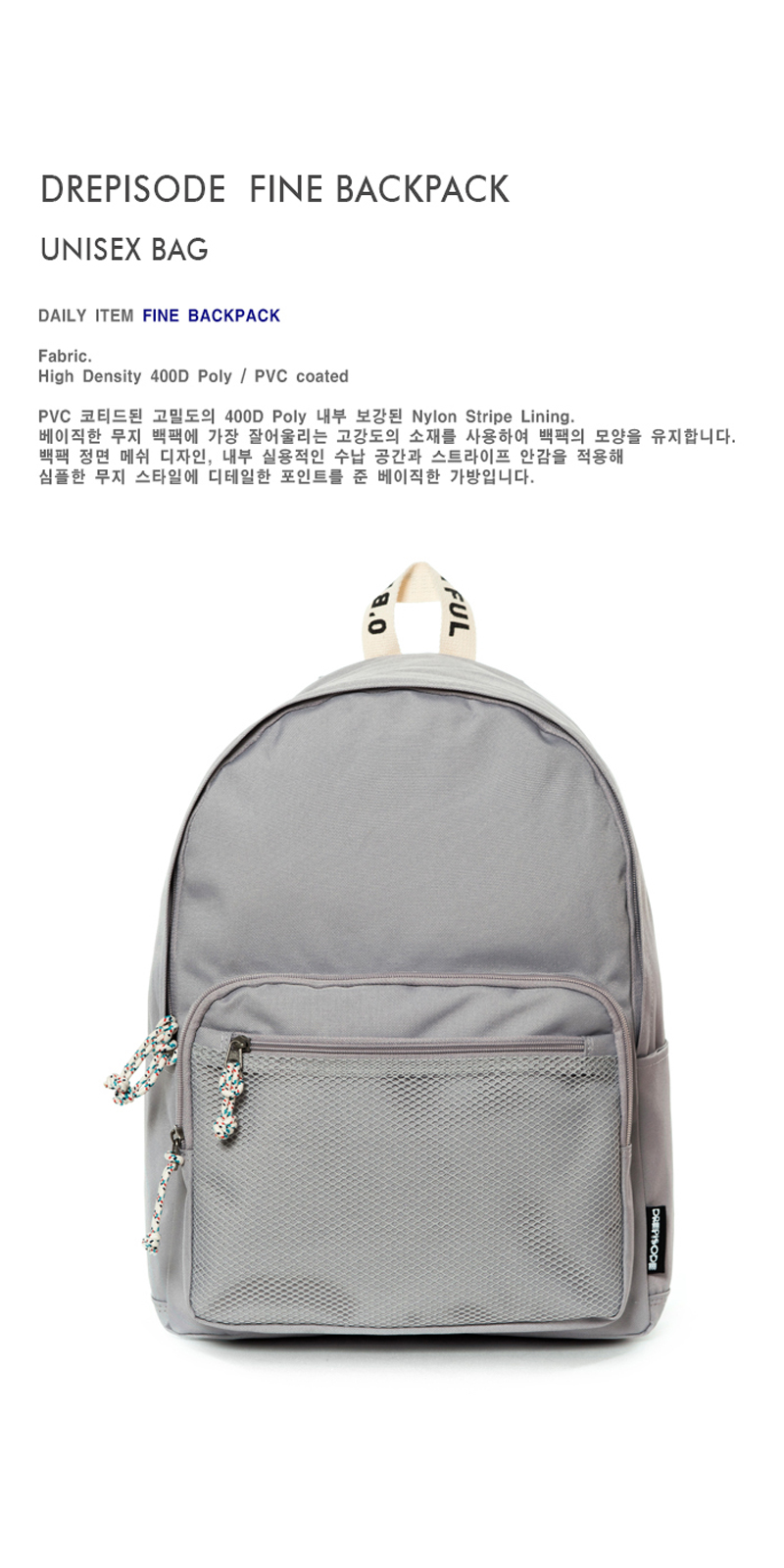 DREPISODE FINE BACKPACK DAILY Item. 트렌디한 메쉬 포켓을 포인트로 한 심플하며 베이직한 백팩입니다.