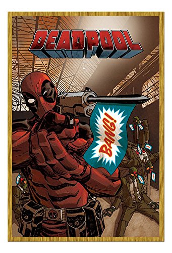 -. Title : Deadpool Gun Bang Poster Magnetic Notice Board Oak Framed - 96.5 x 66 cms (Approx 38 x 26 inches)