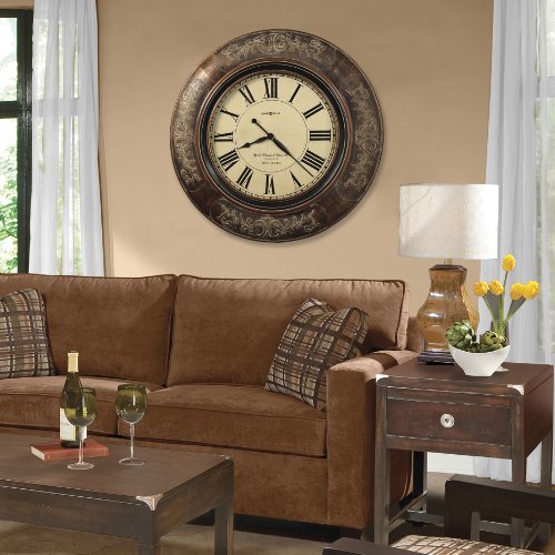- Feature : This 37-1/4" diameter oversized gallery wall clock features a raised vine pattern on the frame, and is finished in burnished brown with a dusty glaze hang up. / Aged parchment dial with aged black Roman numerals, a black and antique gold bezel, and a glass crystal. / Black hour and minute hands. / Quartz, battery operated movement requires 1 AA battery (not included).