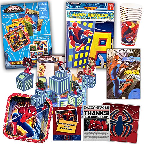 -. Feature : Marvel spiderman party supplies value set -- party favors, party decorations, plates, cups, napkins, invitations and more! / This spiderman birthday party supplies set includes everything you need to throw the ultimate marvel spiderman party! / Marvel spiderman party supplies and decorations set includes: 8 spiderman cups, 8 spiderman cake plates (7"), 16 spiderman napkins, spiderman birthday banner and spiderman tabletop decorations. / Also includes spiderman party favor pack: 8 spiderman treat bags, 8 spiderman blowouts, spiderman stickers, and a spiderman scavenger hunt game. / Includes 8 spiderman invitations with envelopes and 8 spiderman thank-you postcards. This spiderman party supplies set has everything you need for an unbeatable P.R.Ice!