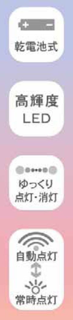 Battery: AA alkaline batteries × 4 (sold separately) ● Battery life: Approx 6 months (when lighting 10 times a day) / Always lighting about 12 hours ● Light movable range: left and right 45 ° down 45 ° ● Light source: 0.5 W