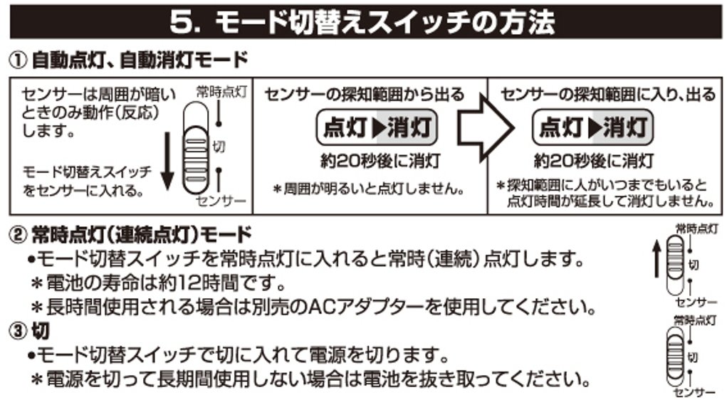 ● «Features» ● Convenient single sensor / handy light of sensor light / handy light ● Sensor mode of automatic lighting when a person approaches / There is always lighting mode that can be used for handy lights and desk lights.