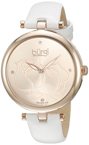 Unique etched roses pattern dial Four genuine diamond markers Quartz Movement Case Diameter: 38mm Water Resistant To 99 Feet Brand : Burgi Item model num : BUR151WTR MPN(PartNumber) : BUR151WTR EAN : 0848572077477