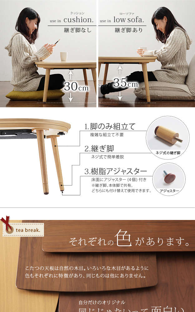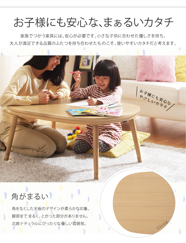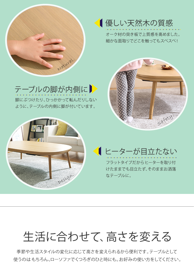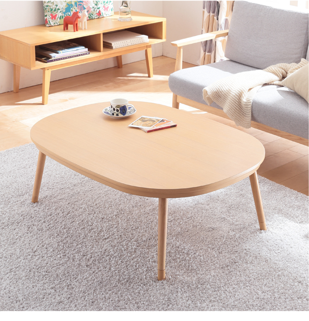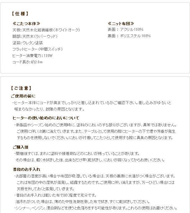 ●材質:こたつ天板-天然木化粧繊維板(ホワイトオーク)、こたつ脚部-天然木(ラバーウッド)・ウレタン塗装、布団表面-アクリル100%、布団裏面-ポリエステル100%