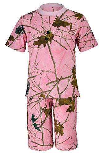 -. Feature : Cotton Poly Blend / Short sleeve t-shirt / short pants with elastic waistband / Pink Forest Camo Camouflage pattern / Imported