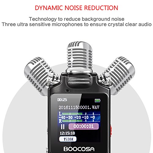 - CRYSTAL CLEAR AUDIO: Using DYNAMIC NOISE REDUCTION technology and three ultra-sensitive microphones, you can get crystal clear audio under any occasions. Clearly record discreet conversations from long distance away. Simply download your favorite songs to the recording device, play music now.