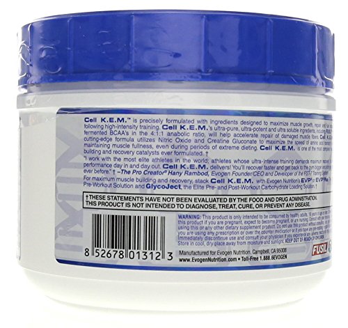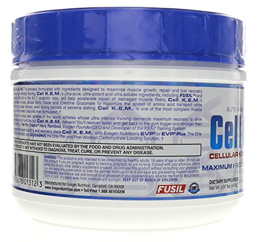 Elite Mass And Recovery Catalyst Cellular Kintic Expansion Matrix Maximum>Recovery |Endurance |Fullness| Cell K.e.m. Is Precisely Formulated With Ingredients Designed To Maximize Muscle Growth, Repair And Fuel Recovery Following High-Intensity Training. Cell K.e.m.'S Ultra-Pure, Ultra-Potent And Ultra Soluble Ingredients, Including Fusil And Fermented Bcaa'S In The 4:1:1 Anabolic Ratio, Will Help Accelerate Repair Of Damaged Muscle Fibers. Cell K.e.m.'S Cutting-Edge Formula Utilizes Nitric Oxide And Creatine Gluconate To Maximize The Speed Of Amino Acid Transport While Maintaining Muscle Fullness, Even During Periods Of Extreme Dieting. Cell K.e.m. Is One Of The Most Complete Muscle Building And Recovery Catalysts Ever Formulated. "I Work With The Most Elite Athletes In The World; Athletes Whose Ultra-Intense Training Demands Maximum Recovery To Drive Performance Day In And Day Out. Cell K.e.m. Delivers! You'Ll Recover Faster And Get Back To The Gym Bigger And Stronger Than Ever Before." -The Pro Creator Hany Rambod, Evogen Founder/ceo And Developer Of The Fst-7 Training System For Maximum Muscle Building And Recovery, Stack Cell K.e.m. With Evogen Nutrition'S Evp Or Evp®Plus, The Elite Pre-Workout Solution And Glycoject, The Elite Pre- And Post-Workout Carbohydrate Loading Solution.Feature