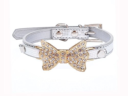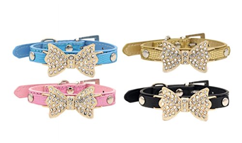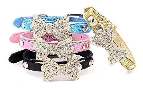 Collar Size: XS: neck size 8.0" - 10.5", wide 0.5", total length 12" S:neck size 10.5" - 13.0", wide 0.5", total length 14.5" Collar Material: high quality PU leather dogs/cats collar Collar Color:black, blue, gold, pink, silver Collar Function: If you want to dress your pets with cat/dog jewelries, our dog/cat collars with bows is good choice for you. This high quality cat/dog collar is perfect for party , wedding holiday gifts. Package includes:1* dog/cat collar rhinestone 0