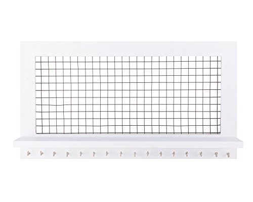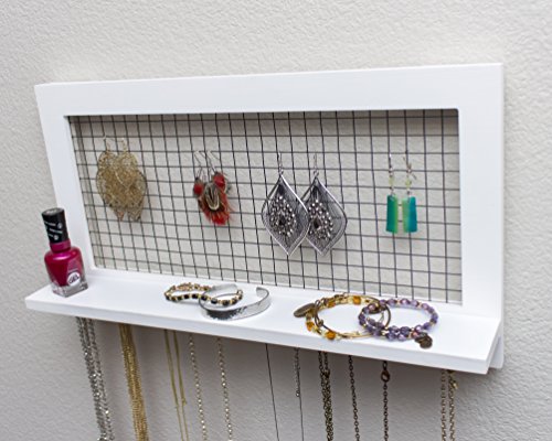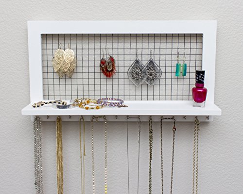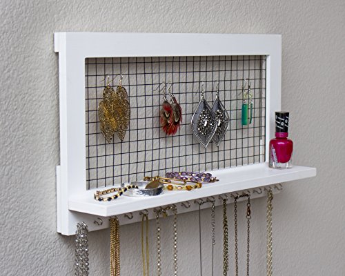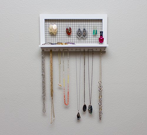 White Wooden Wall Mount Jewelry Organizer for Earrings / Necklaces / Bracelets / Accessories (White- Hooks)