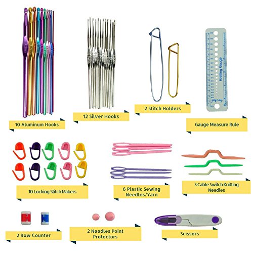 - ★ ABOUT EACH CROCHET SET - In this set you find all you need. 10 Aluminum Hooks 12 Silver Hooks, 2 Aluminium Stich Holders, 1 Stitch Measure Needle Gauge Ruler, 2 Stitch Counters, and 2 sets of Needle Point Covers to keep the points from making holes in your work. See the follow package details.