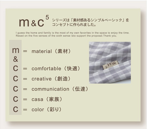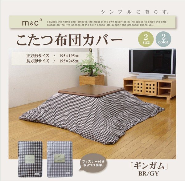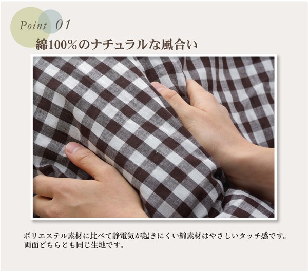 『シンプルでベーシックで素材感のある』をコンセプトに作りました。ベーシックな色目の家具やソファーにに合わせやすい『色』にこだわったコタツ掛け布団カバーです。また、柄も飽きのこない定番のシンプルなチェック柄で仕上げました。表地は綿100%です。綿は繊維の中でも特に肌触りが良いのが特徴です。またポリエステル素材に比べ、静電気が起きにくいとういう特長もあります。肌に直接触れる裏地にはすべすべとした肌感触の短毛生地を使用しています。本商品はファスナータイプですので付け外しが簡単です。