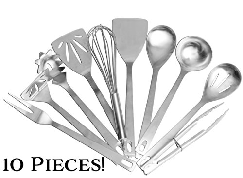 -. Feature : DELUXE SET OF 10: Receive ten unique kitchen gadgets including tongs, fork, ladle, spoon, slotted spoon, spatula (pancake turner); slotted spatula, whisk, potato masher, and pasta server / MULTI-USE: Use for cooking, grilling, prep & serving / HANG-ABLE: Each utensils comes with a slot in handle for easy hanging / MATERIAL: Stainless steel, no worries about plastic or chemicals / SIZE: Varies from 9-inch long tongs to 13-inch long spatulas; width up to 3.5 inches (see description for size details)