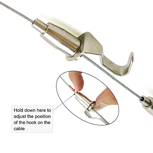 The picture hanging hooks which mounted on cable are adjustable, just press the spring of each hook.