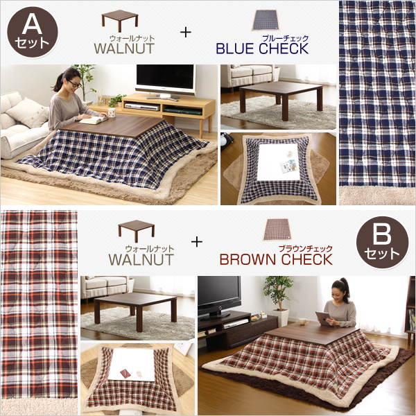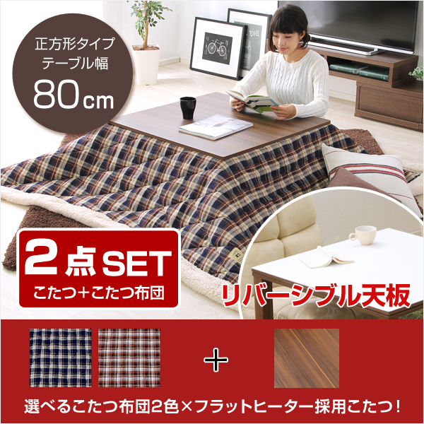 チェック柄こたつ布団セット!フラットヒーターこたつ2点セット(正方形・80cm幅)