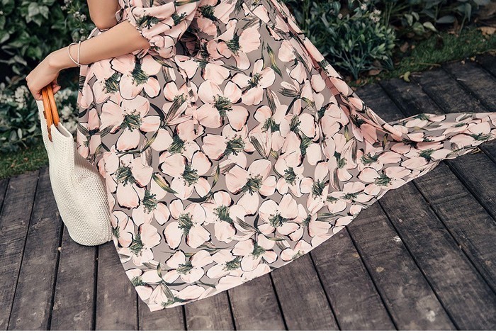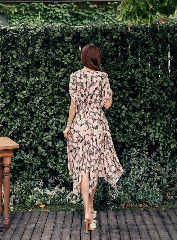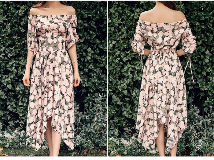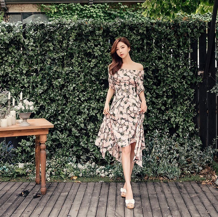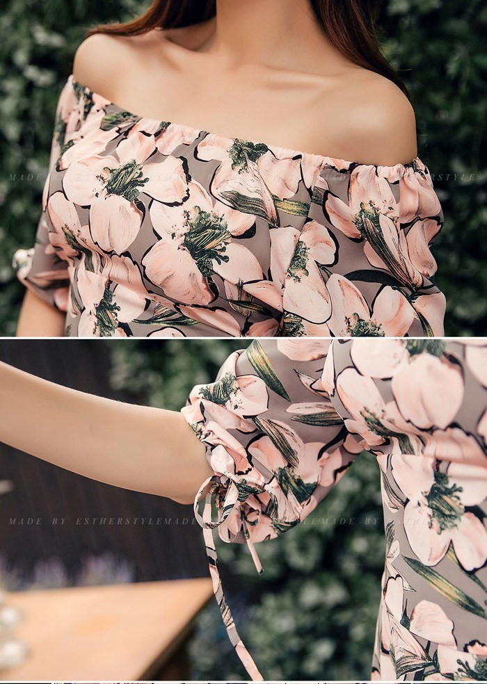 商品名:ワンピース オフショルダー 花柄 フラワー 5分袖 膝丈