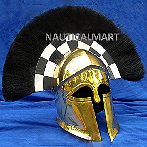 Product Description This exquisite Ancient Greek helm is crafted in brass with painted black, white plume holder. The transverse black plume creates a stunning visual effect. A must for all serious collectors. This helm will not rust! The Greeks used many other styles and types, this Corinthian helm is the one most closely associated with the Greek Hoplite and Alexander of Macedon. Adult size - includes webbing and a chin strap. Height: 510mm (including plume) Width:450mm (including plume) 0