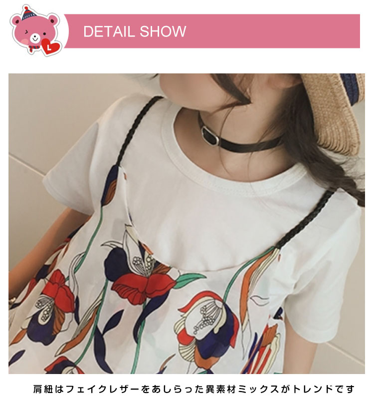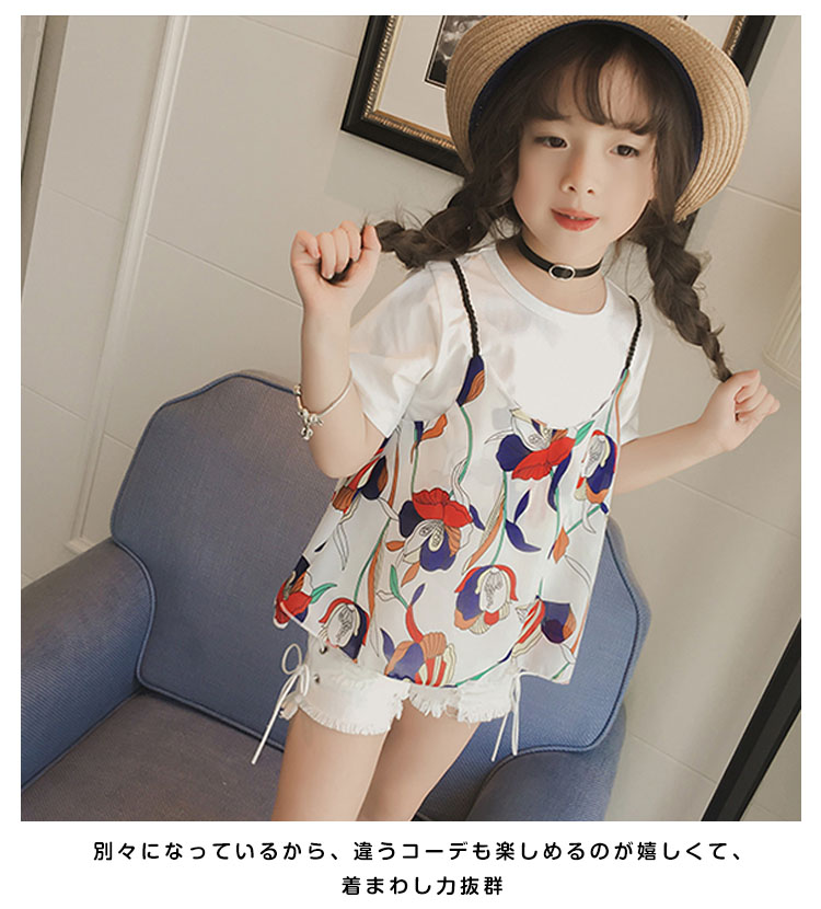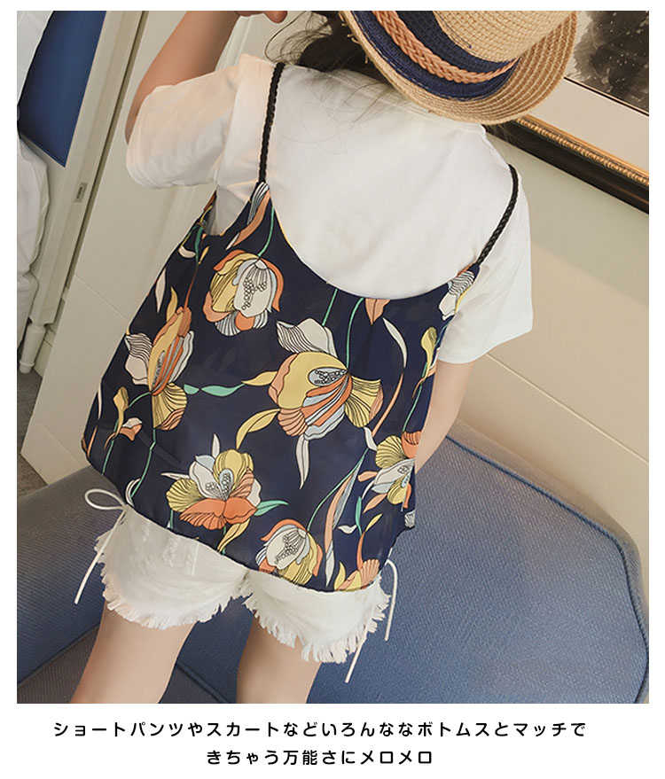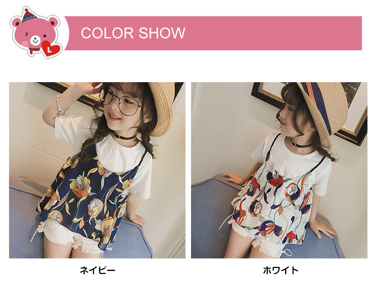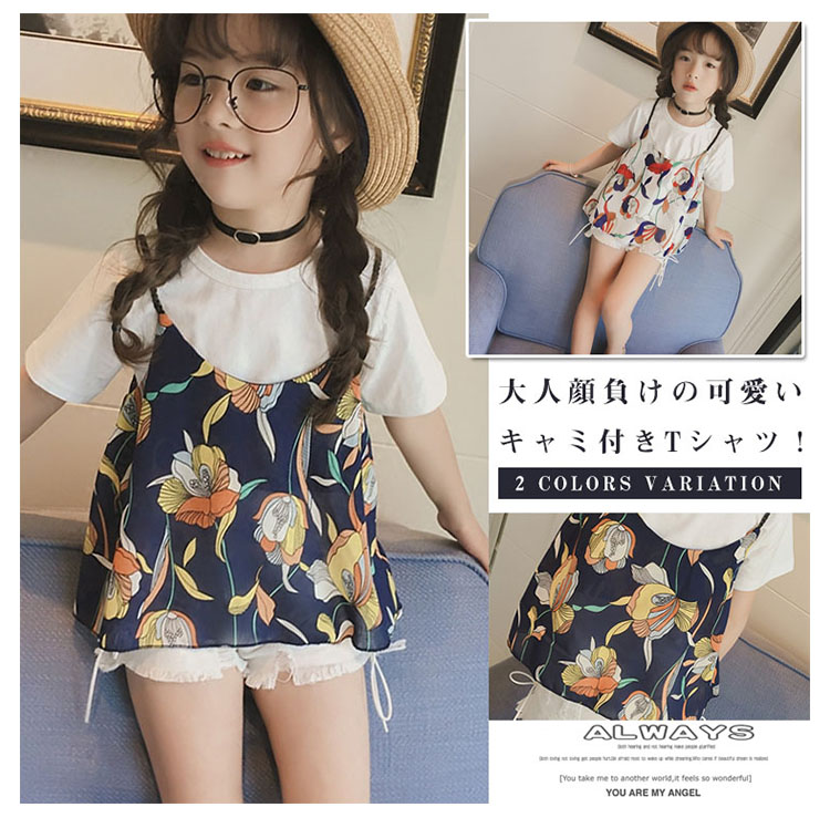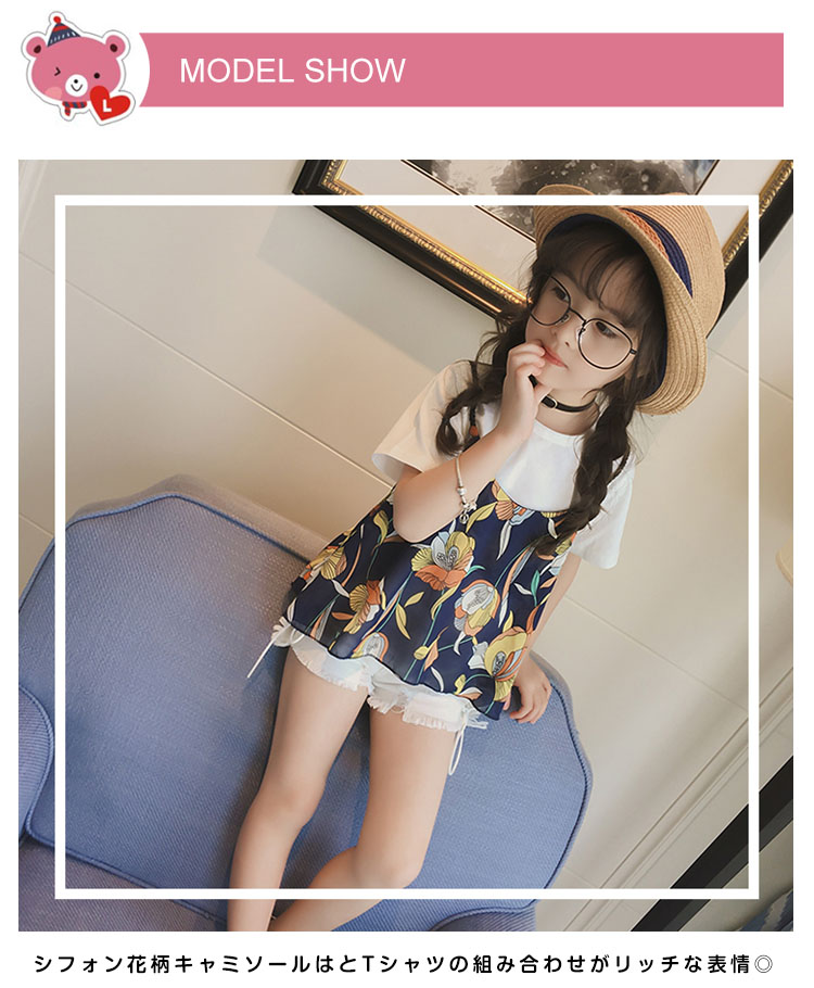 | 大人顔負けの可愛いキャミ付きTシャツ!シフォン花柄キャミソールはとTシャツの組み合わせがリッチな表情◎ショートパンツやスカートなどいろんななボトムスとマッチできちゃう万能さにメロメロ別々になっているから、違うコーデも楽しめるのが嬉しくて、着まわし力抜群 | |