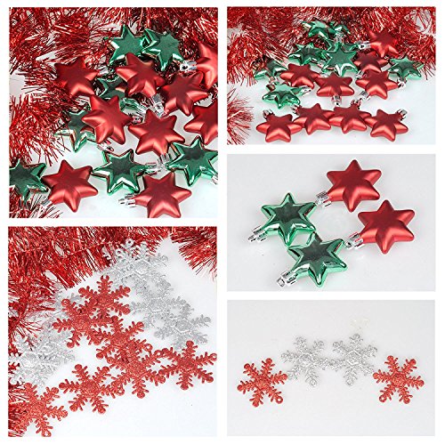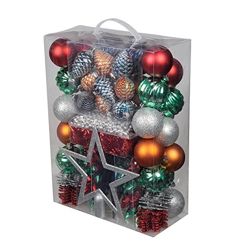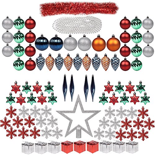 ITART 100ct Christmas Tree Ornaments Assortment including Tree Topper Balls Snowflakes Pine Cone Star Miniature Gift Boxes Tinsel and Beads Garlands Finial Drops (Multi-color)