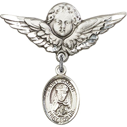 -. Title : Sterling Silver Baby Badge with St. Sarah Charm and Angel w/Wings Badge Pin 1 1/8 X 1 1/8 inches