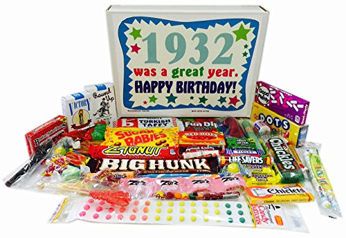 -. Binding : Misc. -. Brand : Woodstock Candy -. Feature : Makes a fun and unique 85th birthday gift for someone born in 1932 / Perfect for someone who has everything / Everyone loves candy! / Comes shrink wrapped in a box that measures 11.75" x 9" x 2" / Box reads "1932 was a Great Year. Happy Birthday!" -. IsAdultProduct : 0 -. Label : Woodstock Candy -. Manufacturer : Woodstock Candy -. PackageQuantity : 1 -. ProductGroup : Grocery -. ProductTypeName : GROCERY -. Publisher : Woodstock Candy -. Studio : Woodstock Candy -. Title : 85th Birthday Gift Box of Nostalgic Retro Candy from Childhood for an 85 Year Old Man or Woman Born in 1932
