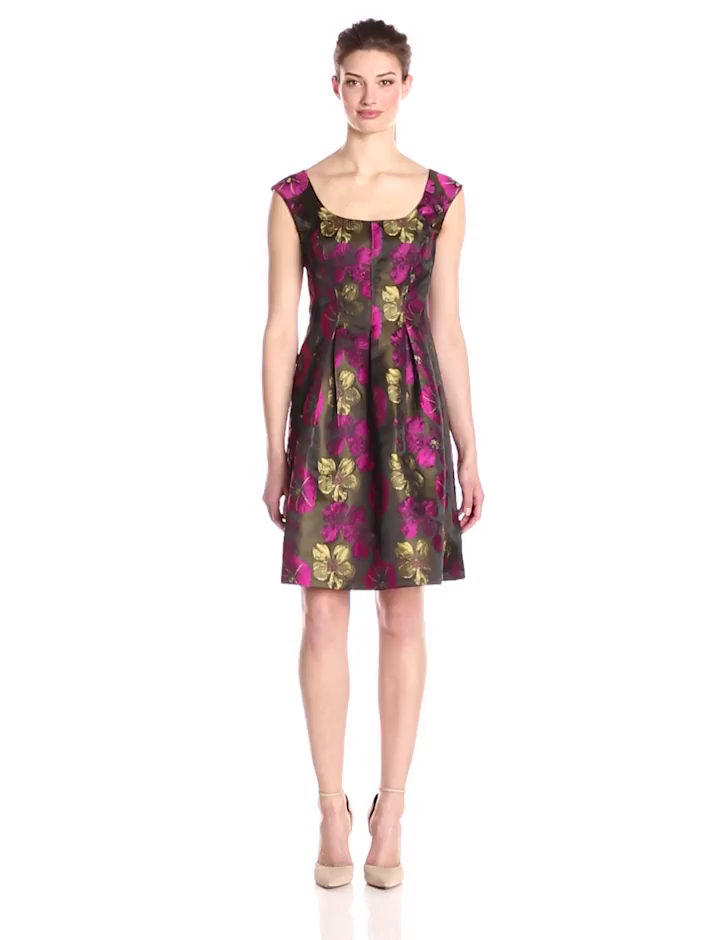 Cap-sleeve dress in metallic-floral print featuring princess-seamed bodice and pleated skirt
