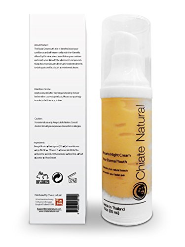 - Feature : ✓REJUVENATING WITH ANTI-AGING BENEFITS - The day-night cream extracted from strictly selected natural herbs in THAILAND, such as the Bengal Roots, which is one of the most widely accepted as an essential material for beauty products production. Bengal roots offer a wide range of benefits, such as decreasing your scar and removing dark spots and making you look younger and look brightener. Contains rich organic and vitamin compounds essential as "food" to your facial skin. / ✓OFFERING ENDLESS BENEFITS - ANTI-AGING, DARK MARKS AND SCARS HEALING, AND BE THE BRIGHTENING CREAM. The use of Bengal Roots herbal extracts will help brighten and make your facial skin more youthful. The VITAMIN E AND NUTRITIONALLY RICH COMPOUNDS will assist you with the healing of the facial dark spots and scars. / ✓NATURAL MATERIAL SELECTION AND ORGANIC PRODUCT - You will be able to tell from the scent and the color of the cream that it contains natural extracts. All the substances used were hand-made and have been proven countless times to be the top class materials of the era. We guarantee that NO CHEMICAL AND DANGEROUS SUBSTANCES , NO FILLERS, NO SLS , NO ANIMAL TESTING, NO PARABENS, NO FRAGRANCES. Plus, our cream has passed lab tests on humans and are proven safe for all types of skins and for every genders. / ✓ THE 4 IN 1 FACIAL CREAM - Boost your confidence and self esteem today with the 4 benefits offered by this miraculous cream. Relieve your stress with the HERBAL AROMA in the very smell of the cream. Maintain your MOISTURE and ENRICH YOUR SKIN with the vitamin rich compounds. Finally, this cream provides the much needed treatments to DARK SPOTS and FACIAL SCARS as mentioned above. / ✓100% AUTHENTIC - DON'T FALL FOR THE FAKE! Only choose the Chiate Natural offered by Chiate Natural for 100% satisfaction! For Amazon Prime members, you will also be eligible for the FREE 2 Day Shipping.