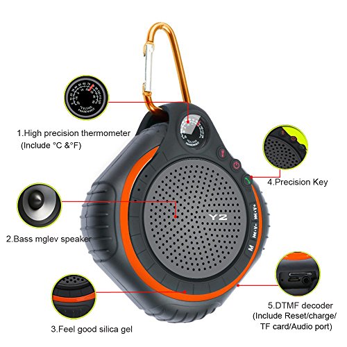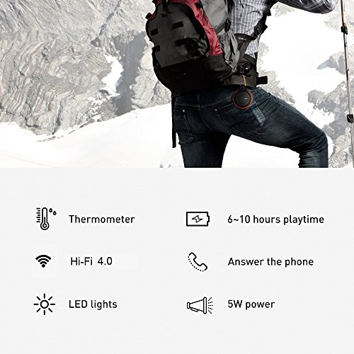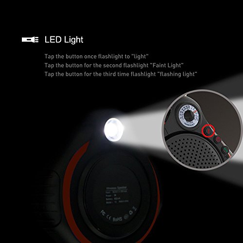 -. Feature : Portable Bluetooth Speaker, Hands-free function, Flash-light, Thermometer, TF Card slot, Aux Input Compatible with Smartphone, Tablet and Laptop Including iPhone, iPad, iPod / This Is The Only True Sport Speaker:Build-in LED light and Temperature Indicator,design for outdoor survive.Longer playtime than other portable speakers:build-in 600mAhrechargeable lithium battery,fast full charge for 3 hours,Incredible 6~10hour playtime.(Depend on volume) / Super-high Profile:Bluetooth CSR4.0(The Best Bluetooth Chip on the market),5W Powerfull Speaker(Support A2DP and it's 5W speaker, so give you much better quality stereo experience.but most of the popular waterproof speaker just have 3W speaker),IPX6 Waterproof Rating(it is thoroughly resistant to water, dust and sand.* You can get it wet, muddy, covered in snow and beaten up, and then hand wash it when you go in) / High Fidelity Sound: Unique design red outdoor Bluetooth wireless speaker delivers a room filling, crystal clear sound through the powerful 5W driver. Excellent bass performance, suitable for indoor and outdoor activities. / Bluetooth 4.0 technology:Connect your outdoor speaker in just seconds with a wireless range up to 33 feet away from your iPhone, iPad, Android / Windows smartphones, tablets, MP3, MP4, digital media player and Bluetooth enabled music devices
