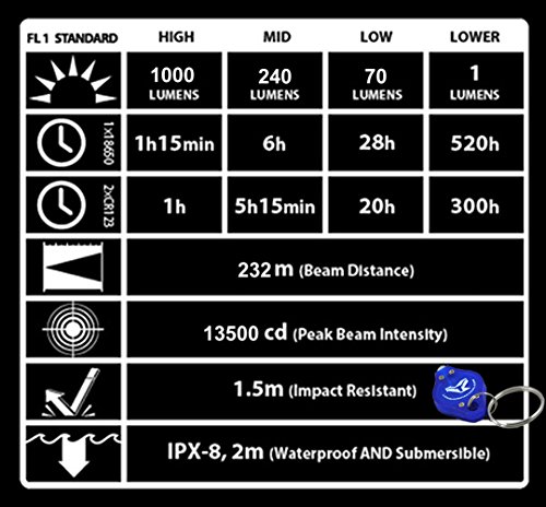 - SUPER BRIGHT- 1000 lumen beam with Cree XM-L2 U2 LED and impressive 253 yard throw