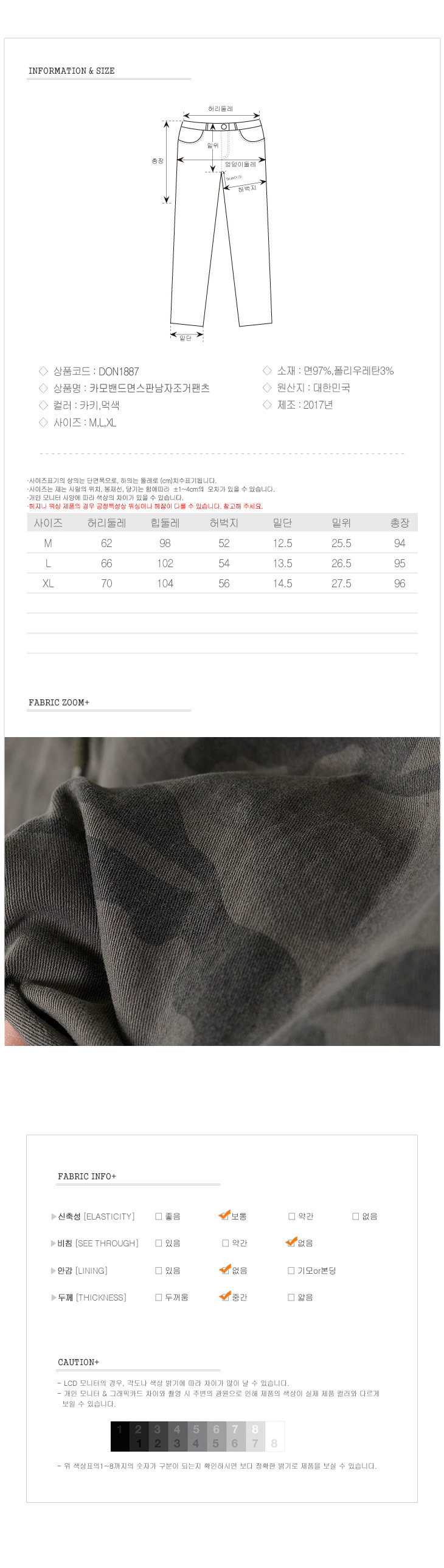 자연스러운 밀리터리 나염에 부드러운 워싱으로 두가지의 환상적인 궁합이 멋스러운 팬츠를 완성되겠습니다.